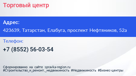 Торговый центр по адресу 423639, Татарстан, Елабуга, проспект Нефтяников, 52а в дальнейшем Организация, размещена в следующих категориях: