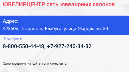 ЮВЕЛИРЦЕНТР, сеть ювелирных салонов по адресу 423606, Татарстан, Елабуга, улица Марджани, 34 в дальнейшем Организация, размещена в следующих категориях: