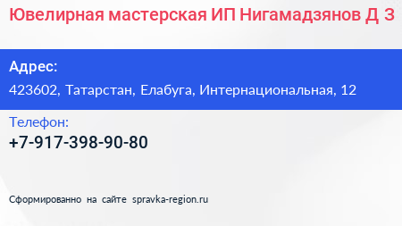 Ювелирная мастерская, ИП Нигамадзянов Д.З. по адресу 423602, Татарстан, Елабуга, Интернациональная, 12 в дальнейшем Организация, размещена в следующих категориях:
