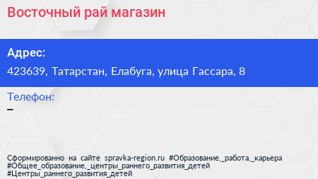 Восточный рай, магазин по адресу 423639, Татарстан, Елабуга, улица Гассара, 8 в дальнейшем Организация, размещена в следующих категориях: