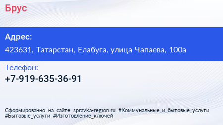 Брус по адресу 423631, Татарстан, Елабуга, улица Чапаева, 100а в дальнейшем Организация, размещена в следующих категориях: