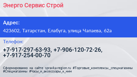 Энерго Сервис Строй по адресу 423602, Татарстан, Елабуга, улица Чапаева, 62а в дальнейшем Организация, размещена в следующих категориях:
