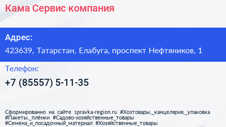 Кама-Сервис, компания по адресу 423639, Татарстан, Елабуга, проспект Нефтяников, 1 в дальнейшем Организация, размещена в следующих категориях: