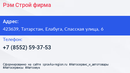 Рэм Строй, фирма по адресу 423639, Татарстан, Елабуга, Спасская улица, 6 в дальнейшем Организация, размещена в следующих категориях: