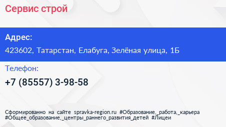 Сервис-строй по адресу 423602, Татарстан, Елабуга, Зелёная улица, 1Б в дальнейшем Организация, размещена в следующих категориях: