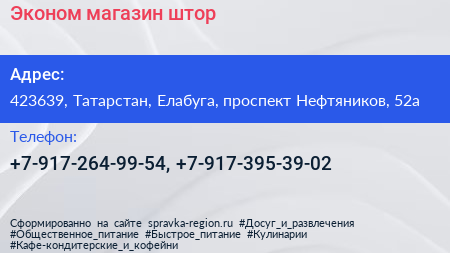Эконом-магазин штор по адресу 423639, Татарстан, Елабуга, проспект Нефтяников, 52а в дальнейшем Организация, размещена в следующих категориях: