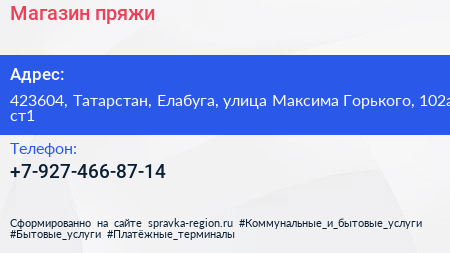 Магазин пряжи по адресу 423604, Татарстан, Елабуга, улица Максима Горького, 102а ст1 в дальнейшем Организация, размещена в следующих категориях: