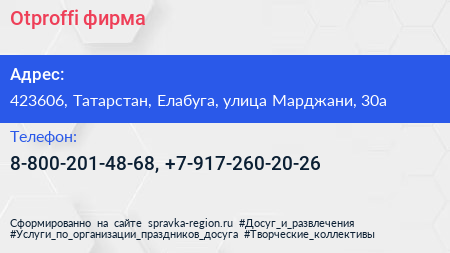 Otproffi, фирма по адресу 423606, Татарстан, Елабуга, улица Марджани, 30а в дальнейшем Организация, размещена в следующих категориях: