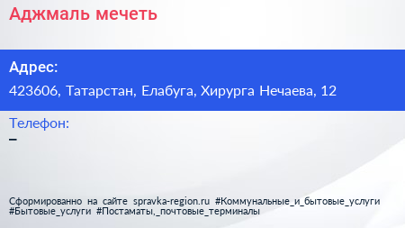 Аджмаль, мечеть по адресу 423606, Татарстан, Елабуга, Хирурга Нечаева, 12 в дальнейшем Организация, размещена в следующих категориях: