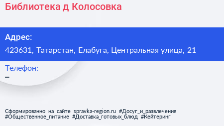 Библиотека, д. Колосовка по адресу 423631, Татарстан, Елабуга, Центральная улица, 21 в дальнейшем Организация, размещена в следующих категориях:
