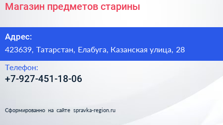 Магазин предметов старины по адресу 423639, Татарстан, Елабуга, Казанская улица, 28 в дальнейшем Организация, размещена в следующих категориях: