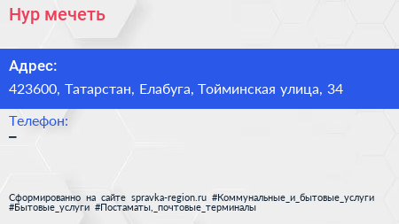 Нур, мечеть по адресу 423600, Татарстан, Елабуга, Тойминская улица, 34 в дальнейшем Организация, размещена в следующих категориях: