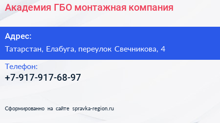 Академия ГБО, монтажная компания по адресу Татарстан, Елабуга, переулок Свечникова, 4 в дальнейшем Организация, размещена в следующих категориях: