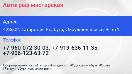 Автограф, мастерская по адресу 423602, Татарстан, Елабуга, Окружное шоссе, 9г ст1 в дальнейшем Организация, размещена в следующих категориях: