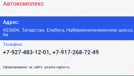Автокомплекс по адресу 423604, Татарстан, Елабуга, Набережночелнинское шоссе, 6а в дальнейшем Организация, размещена в следующих категориях: