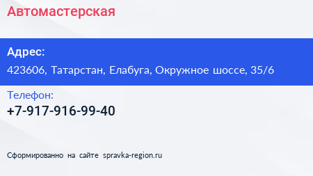 Автомастерская по адресу 423606, Татарстан, Елабуга, Окружное шоссе, 35/6 в дальнейшем Организация, размещена в следующих категориях: