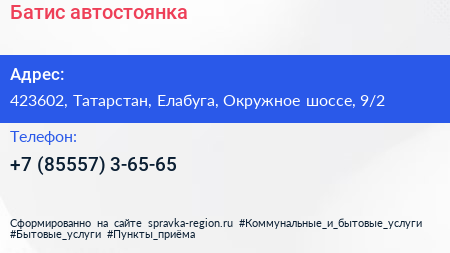 Батис, автостоянка по адресу 423602, Татарстан, Елабуга, Окружное шоссе, 9/2 в дальнейшем Организация, размещена в следующих категориях: