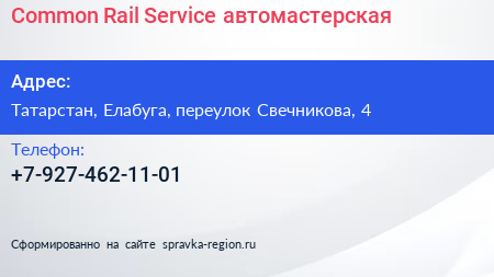 Common Rail Service, автомастерская по адресу Татарстан, Елабуга, переулок Свечникова, 4 в дальнейшем Организация, размещена в следующих категориях: