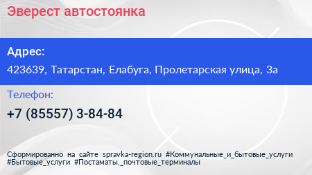 Эверест, автостоянка по адресу 423639, Татарстан, Елабуга, Пролетарская улица, 3а в дальнейшем Организация, размещена в следующих категориях: