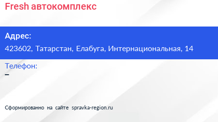 Fresh, автокомплекс по адресу 423602, Татарстан, Елабуга, Интернациональная, 14 в дальнейшем Организация, размещена в следующих категориях: