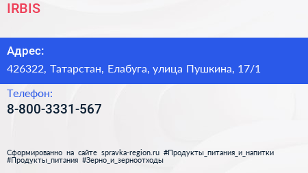IRBIS по адресу 426322, Татарстан, Елабуга, улица Пушкина, 17/1 в дальнейшем Организация, размещена в следующих категориях:
