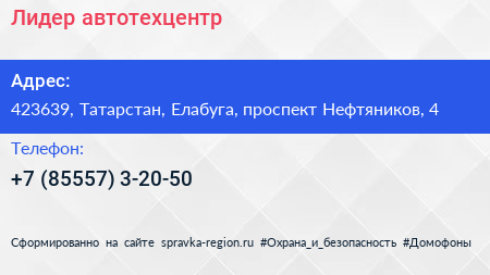 Лидер, автотехцентр по адресу 423639, Татарстан, Елабуга, проспект Нефтяников, 4 в дальнейшем Организация, размещена в следующих категориях: