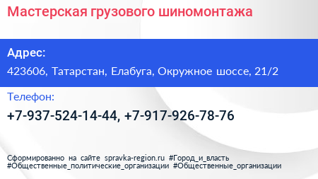 Мастерская грузового шиномонтажа по адресу 423606, Татарстан, Елабуга, Окружное шоссе, 21/2 в дальнейшем Организация, размещена в следующих категориях: