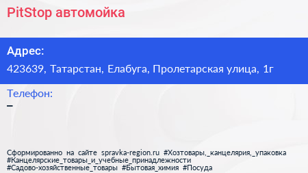 PitStop, автомойка по адресу 423639, Татарстан, Елабуга, Пролетарская улица, 1г в дальнейшем Организация, размещена в следующих категориях: