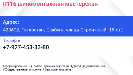 R116, шиномонтажная мастерская по адресу 423602, Татарстан, Елабуга, улица Строителей, 19 ст1 в дальнейшем Организация, размещена в следующих категориях: