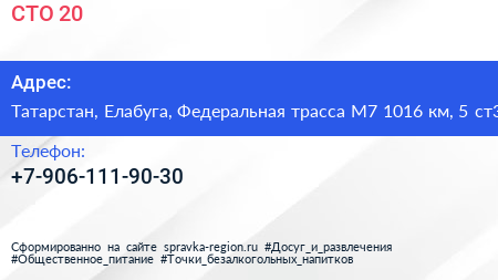 СТО-20 по адресу Татарстан, Елабуга, Федеральная трасса М7 1016 км, 5 ст3 в дальнейшем Организация, размещена в следующих категориях: