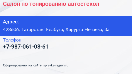 Салон по тонированию автостекол по адресу 423606, Татарстан, Елабуга, Хирурга Нечаева, 3а в дальнейшем Организация, размещена в следующих категориях: