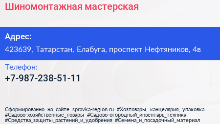 Шиномонтажная мастерская по адресу 423639, Татарстан, Елабуга, проспект Нефтяников, 4в в дальнейшем Организация, размещена в следующих категориях: