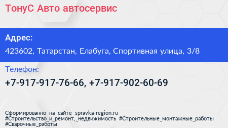 ТонуС-Авто, автосервис по адресу 423602, Татарстан, Елабуга, Спортивная улица, 3/8 в дальнейшем Организация, размещена в следующих категориях: