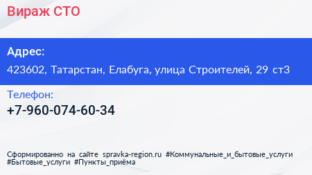 Вираж, СТО по адресу 423602, Татарстан, Елабуга, улица Строителей, 29 ст3 в дальнейшем Организация, размещена в следующих категориях: