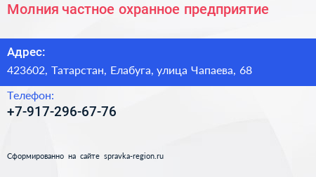 Молния, частное охранное предприятие по адресу 423602, Татарстан, Елабуга, улица Чапаева, 68 в дальнейшем Организация, размещена в следующих категориях: