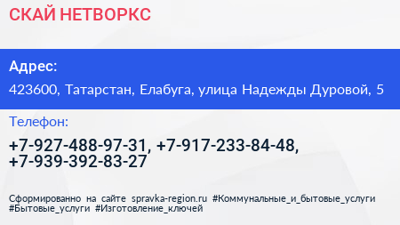 СКАЙ НЕТВОРКС по адресу 423600, Татарстан, Елабуга, улица Надежды Дуровой, 5 в дальнейшем Организация, размещена в следующих категориях: