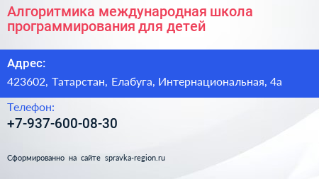 Алгоритмика, международная школа программирования для детей по адресу 423602, Татарстан, Елабуга, Интернациональная, 4а в дальнейшем Организация, размещена в следующих категориях:
