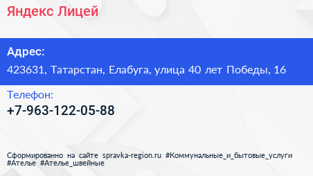 Яндекс.Лицей по адресу 423631, Татарстан, Елабуга, улица 40 лет Победы, 16 в дальнейшем Организация, размещена в следующих категориях: