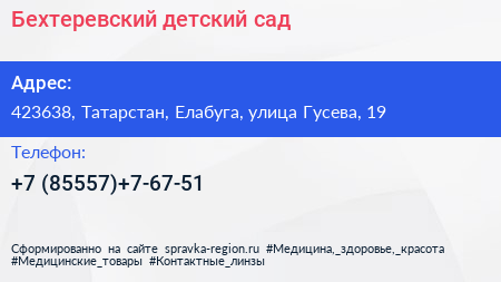 Бехтеревский детский сад по адресу 423638, Татарстан, Елабуга, улица Гусева, 19 в дальнейшем Организация, размещена в следующих категориях: