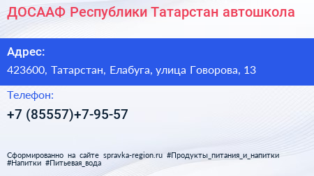 ДОСААФ Республики Татарстан, автошкола по адресу 423600, Татарстан, Елабуга, улица Говорова, 13 в дальнейшем Организация, размещена в следующих категориях: