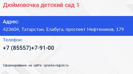 Дюймовочка, детский сад №1 по адресу 423604, Татарстан, Елабуга, проспект Нефтяников, 179 в дальнейшем Организация, размещена в следующих категориях: