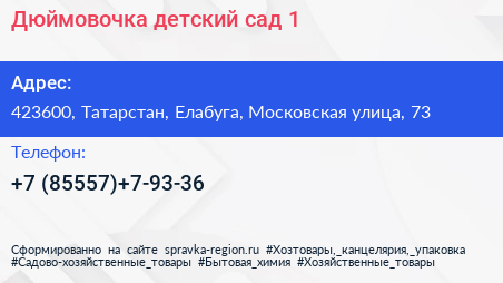 Дюймовочка, детский сад №1 по адресу 423600, Татарстан, Елабуга, Московская улица, 73 в дальнейшем Организация, размещена в следующих категориях:
