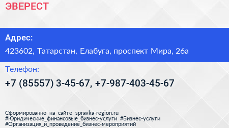 ЭВЕРЕСТ по адресу 423602, Татарстан, Елабуга, проспект Мира, 26а в дальнейшем Организация, размещена в следующих категориях: