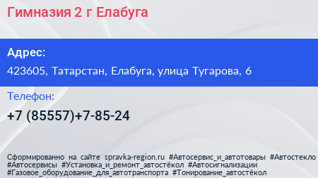 Гимназия №2, г. Елабуга по адресу 423605, Татарстан, Елабуга, улица Тугарова, 6 в дальнейшем Организация, размещена в следующих категориях: