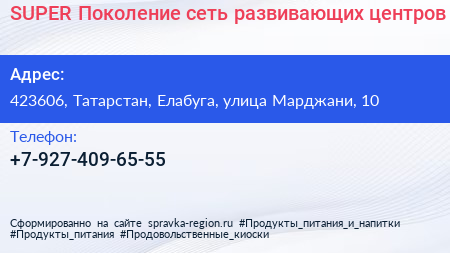 SUPER Поколение, сеть развивающих центров по адресу 423606, Татарстан, Елабуга, улица Марджани, 10 в дальнейшем Организация, размещена в следующих категориях: