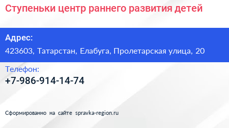 Ступеньки, центр раннего развития детей по адресу 423603, Татарстан, Елабуга, Пролетарская улица, 20 в дальнейшем Организация, размещена в следующих категориях: