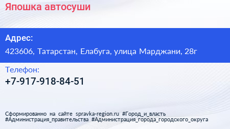 Япошка, автосуши по адресу 423606, Татарстан, Елабуга, улица Марджани, 28г в дальнейшем Организация, размещена в следующих категориях: