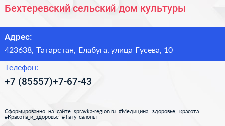 Бехтеревский сельский дом культуры по адресу 423638, Татарстан, Елабуга, улица Гусева, 10 в дальнейшем Организация, размещена в следующих категориях: