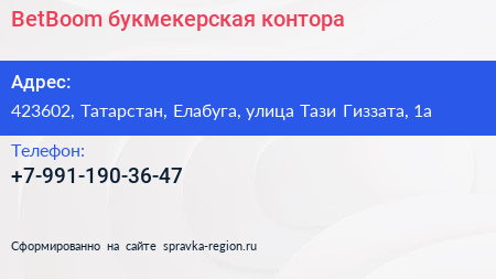 BetBoom, букмекерская контора по адресу 423602, Татарстан, Елабуга, улица Тази Гиззата, 1а в дальнейшем Организация, размещена в следующих категориях:
