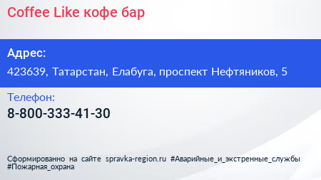 Coffee Like, кофе-бар по адресу 423639, Татарстан, Елабуга, проспект Нефтяников, 5 в дальнейшем Организация, размещена в следующих категориях: